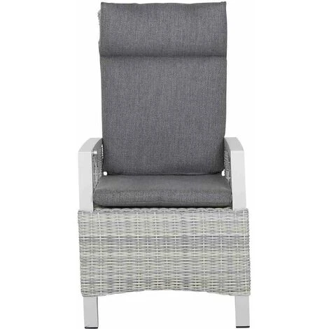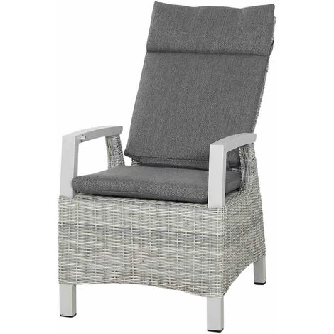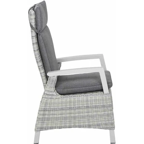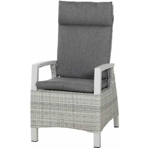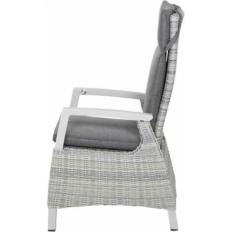 Aluminiumgestell und -armlehnen in matt weiß-grau Gardino®-Geflecht in ice grey, halbrund Auflage aus Polypropylen in grau, mit Reißverschluss Verstellung erfolgt bequem über einen innenliegenden Knopf in der Armlehne
